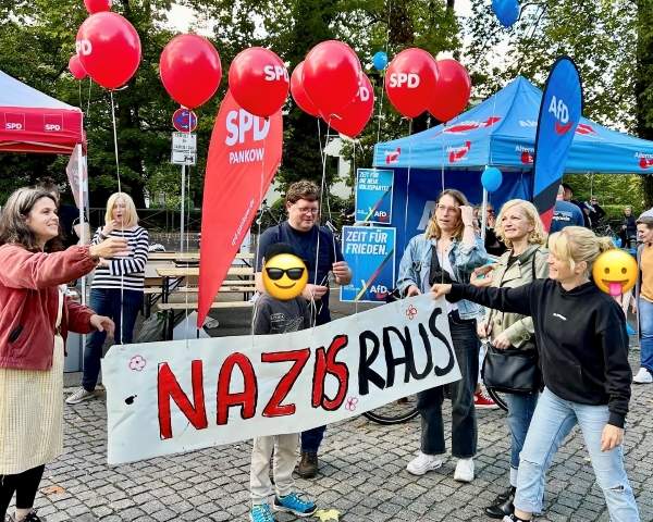 Es gab gute Laune, rote Luftballons und leckeres Wassereis für die Kinder. Unsere besondere Aktion: Mauerpark-Graffitis malen – dabei ist auch ein richtiges und wichtiges Transparent entstanden! Mit dabei waren Thomas Bohla aus der BVV, unsere Bezirksstadträtin Rona Tietje, Linda Vierecke, Mitglied des Abgeordnetenhauses, sowie viele engagierte Genoss*innen.